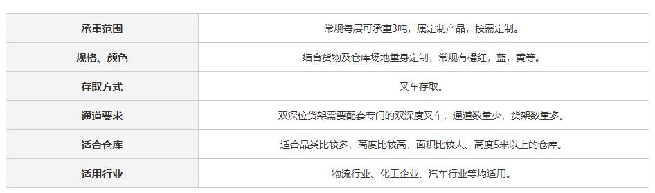 雙深位貨架也為橫梁式貨架一種,通道比橫梁式貨架少很多,單邊為雙排,背靠背為4排擺放,提高了倉庫的利用率;雙深位貨架需要配專門的雙深度叉車。